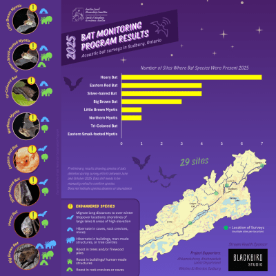 Sudbury is home to 8 amazing bat species! Sadly, 7 out of the 8 Ontario species of bats are endangered due to habitat loss, climate change, and disease. To help reverse this trend, JCSC is taking action through a multi-pronged approach: