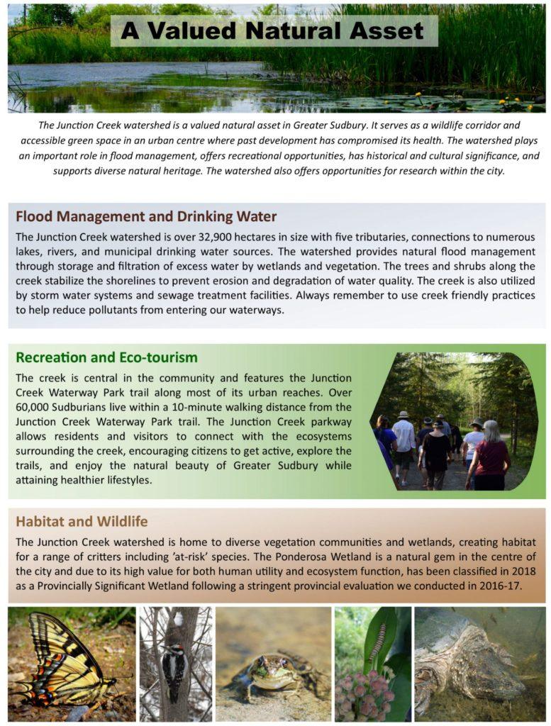 The Junction Creek watershed is a natural valued asset. It serves as a wildlife corridor and accessible green space in an urban centre where past development has compromised its health. The watershed plays an important role in flood management, carbon storage, offers recreational and research opportunities, has historical and cultural significance, and supports diverse natural heritage. Restoring the watershed to a thriving ecosystem results in mutual benefits towards the health and resilience of the community and economic growth.